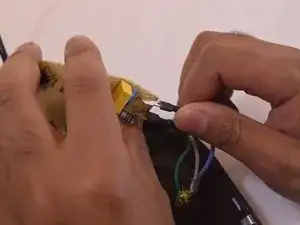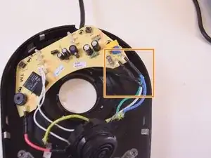 Найдите синие и чёрные провода, которые соединяются с печатной платой от сетевого шнура. При умеренном усилии оттяните их от серебристых клемм на плате.