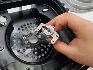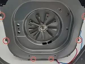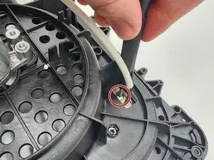 Используйте отвертку Phillips #0 и гибкое удлинение 150 мм, чтобы открутить нижний пластик, соединённый с держателем корзины.