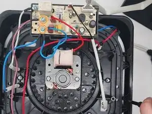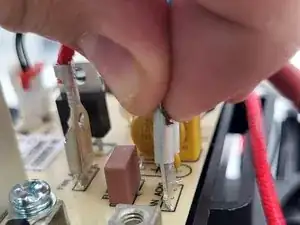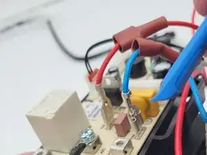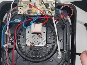 Снимите 2 кабеля, соединяющие нагревательную спираль с распределительной платой сверху камеры приготовления: один синий и один белый кабель, оба в белой изоляции, ведущей в камеру приготовления.