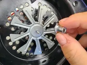Используя головку 3/8", открутите шестигранную гайку, удерживающую вентилятор, не прилагая лишнего усилия к вентилятору, чтобы избежать его деформации.