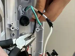 Используя бокорезы или плоскогубцы, отрежьте оригинальный сетевой кабель и провода белого, черного и красного цвета как можно ближе к пластиковым защитным колпачкам.