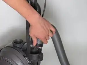 Выключите питание и отключите пылесос от сети, затем поверните пылесос, чтобы посмотреть на шланг.