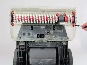 Используйте длинную отвертку Phillips #2, чтобы удалить 8 пронумерованных винтов на дне пылесоса.