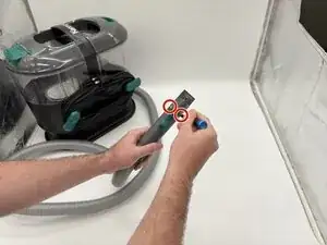 Открутите два винта Phillips #1 размером 10 мм на распылителе и отложите их вместе с пластиковым покрытием и пластиковым переключателем.