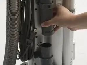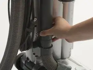 Найдите верхнее соединение шланга, расположенное непосредственно под основанием ручки. Нажмите на защелку с внешней стороны трубки большим пальцем.
