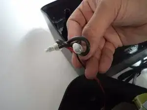 Удалите 2 винта (13 мм, голова 6 мм), крепящих пластиковую деталь, удерживающую шнур питания.