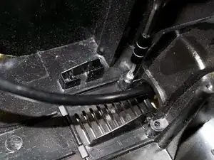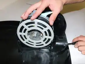 Открутите два винта под контейнером для пыли внутри пылесоса.