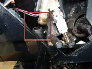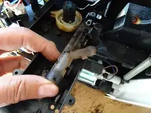 Если кофе больше не течёт нормально, причиной часто является сливной клапан. Чтобы получить доступ к сливному клапану, необходимо отсоединить привод. Это показано здесь.