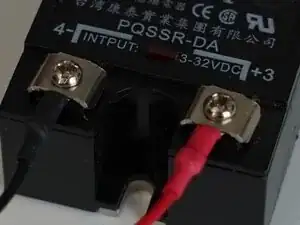 Обратите внимание, что это поляризованное соединение. Подключайте красный/оранжевый к (+), а чёрный/коричневый к (-) на SSR.