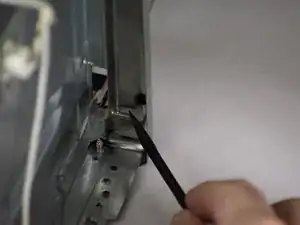 Используйте чёрную лопатку, чтобы аккуратно нажать на защёлки петель в нижней части дверцы.