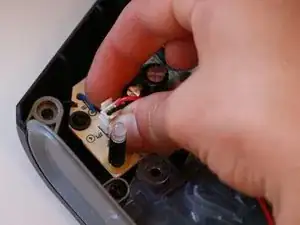 Сожмите защёлки на зажиме печатной платы для светодиодной фары внутрь и потяните зажим вверх и прочь, чтобы отсоединить фару.