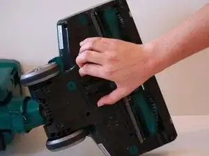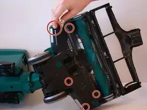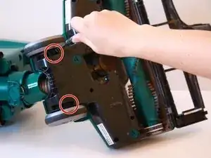 Используя отвёртку T20, отвинтите два винта длиной 15,9 мм за колёсами пылесоса.