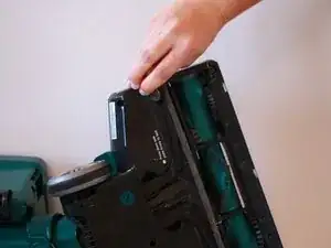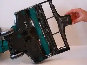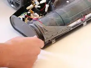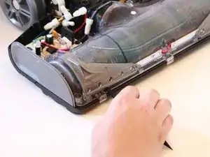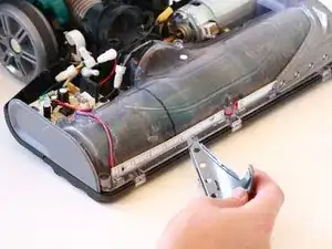 Верните пылесос в вертикальное положение и с помощью лопатки подденьте переднюю крышку, распарывая шов между цветной передней панелью и серыми боковыми крышками.