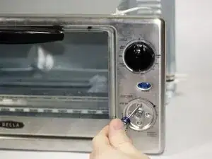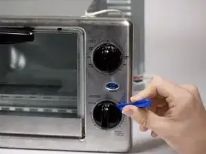 С помощью пластиковой лопатки аккуратно отведите чёрную пластиковую ручку таймера от лицевой панели тостера.