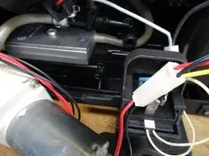 Мотор сливного клапана расположен в нижней части устройства около центра. Он крепится тремя винтами и подключён к нескольким плоским разъёмам. На изображении керамический клапан уже сдвинут.