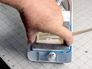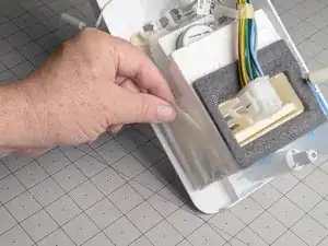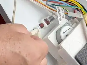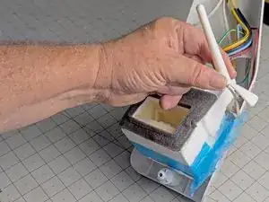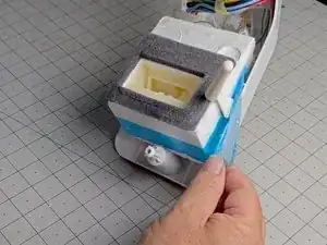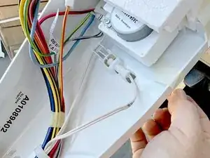 Возьмите термистор морозильного отделения и оттяните его от пенного узла заслонки на корпусе управления, чтобы освободить его из посадочного места.