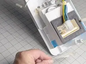 Поднимите узел заслонки вверх, чтобы получить доступ к синей ленте, удерживающей термистор морозильного отделения.