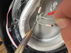 Нагрейте припой паяльником в точке контакта до расплавления, чтобы припой образовал шарик на головке термовыключателя.
