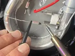 Держите хвостовую часть нового термовыключателя пинцетом в точке контакта от предыдущего выключателя.