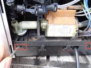 Вставьте плоскую отвёртку в прорези слева и справа и прижмите зажими вверх. Одновременно тяните кронштейн насоса назад.