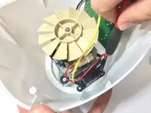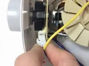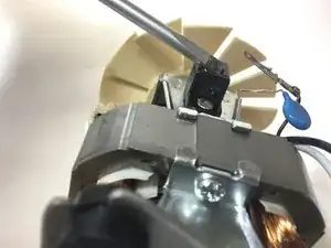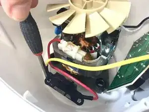 Открутите чёрный блок, в котором находится предохранительный выключатель, рядом с местом крепления мотора к корпусу. Теперь можно вынуть мотор из корпуса.