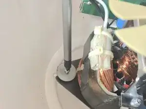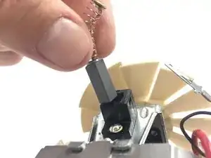 Надавив немного, вставьте крестовую отвёртку №0 в маленький чёрный паз рядом с местом, где вы распаяли конденсатор. Используйте её, чтобы зажать зажим, удерживающий щётку на месте.