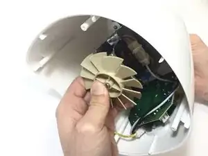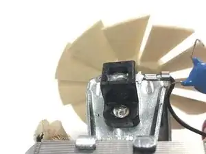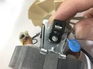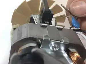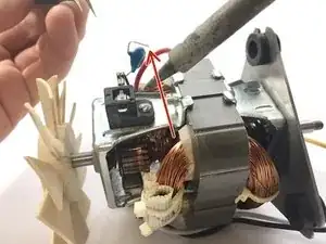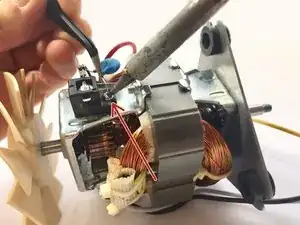 При помощи паяльника разогрейте припой, крепящий конденсатор к боковой части мотора. То же нужно повторить с другой стороны мотора, так как есть два конденсатора (плюсовой и минусовой).