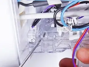 Используйте плоскую отвёртку или аналогичный инструмент, чтобы нажать пластиковую защёлку в сторону узла диспенсера.