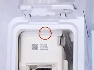 При обратной сборке убедитесь, что эта крышка полностью защёлкнулась, иначе лоток для льда не будет правильно задвигаться.