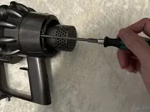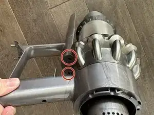 Используйте крестовую отвертку Philips #1, чтобы снять два винта 16,5 мм под средней частью пылесоса, перед ручкой.