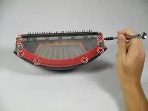 Положите контейнер для пыли и снимите шесть винтов 15 мм вокруг внешней части контейнера с помощью отвертки Phillips JIS #1.