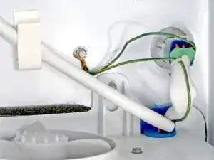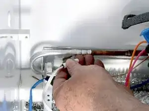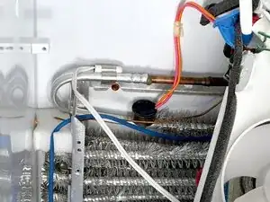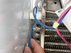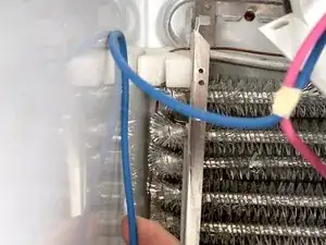 Отстегните оба нагревательных провода от их пенопластовых фиксаторо в, расположенных возле боков катушки испарителя, чтобы корпус вентилятора испарителя мог двигаться свободнее.