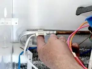 Подтяните термостат оттайки вверх, чтобы отщёлкнуть его от трубок испарителя.