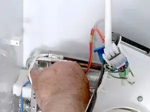 Отключите разъём льдогенератора, ослабив фиксирующие зажимы — поднимите их, если возможно, затем вытащите штекер из гнезда. На фото показано гнездо со снятым штекером.