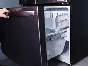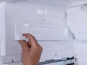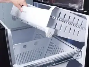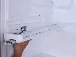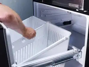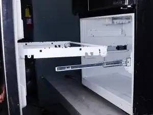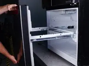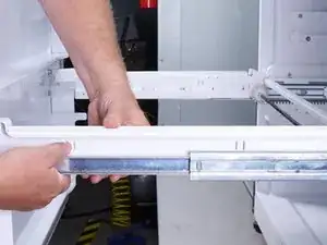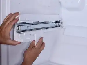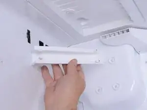 Если вы снимаете крышку испарителя морозильной камеры, возможно, потребуется снять только левые направляющие. В некоторых случаях необходимо повторить три предыдущих шага для снятия правых направляющих.