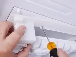 Подденьте отвёрткой наружу, чтобы освободить фиксатор, крепящий лёдогенератор к холодильнику.