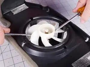 Разместите головки отверток напротив друг друга под ступицей вентилятора.