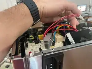 Отсоедините красный кабель, который соединяет вентилятор охлаждения с платой. Сожмите защёлку на красном разъёме и одновременно слегка потяните, чтобы освободить его.