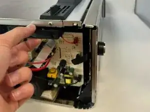 Снимите панель с торца управления. Чтобы снять её, сдвиньте вперёд в направлении передней панели управления, чтобы освободить защёлки из корпуса. Отогните боковую панель, когда защёлки визуально выйдут из своих посадочных мест в корпусе.
