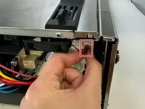 Сдвиньте чёрный вентилятор охлаждения и извлеките его. По бокам имеются удерживающие защёлки, которые нужно приподнять для освобождения вентилятора.
