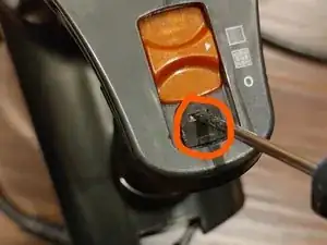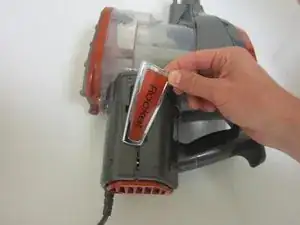 Поставьте пылесос на бок и найдите оранжевые защёлки с надписью "Rocket" по обеим сторонам пылесоса.