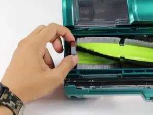 Сдвиньте защёлки от центра пылесоса, чтобы разблокировать крышку щётки.