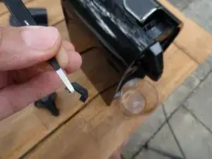 Вставьте инструмент для открытия в зазор между носиком для кофе и боковой панелью с правой стороны. Отодвиньте боковую панель на несколько миллиметров и надавите на инструмент вниз, пока боковая панель в передней части не освободится с громким треском