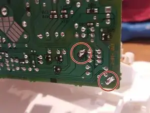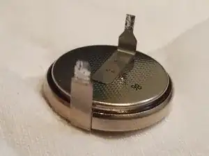 Батарея должна быть удалена путем выпаивания двух точек, показанных на изображении. Обратите внимание на полярность батареи перед удалением.