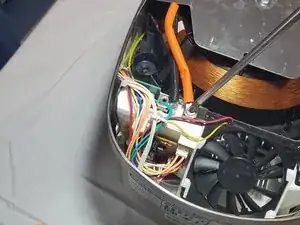 Открутите винты, которые соединяют толстые чёрный и оранжевый кабели с радиатором.