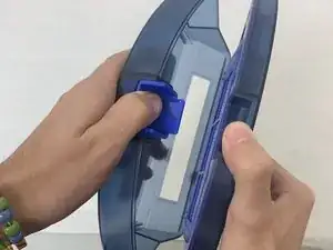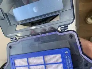 Нажмите на синюю зажимку и разъедините две стороны контейнера для пыли, открывая их как книгу.