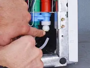 Нажмите на жёлтое пластиковое кольцо над задним водяным шлангом, чтобы освободить его защёлки.