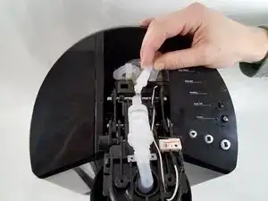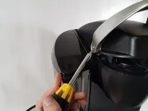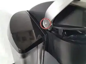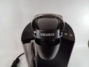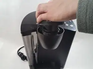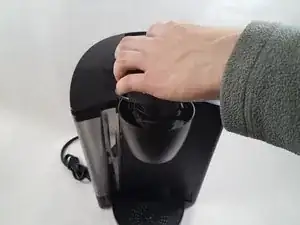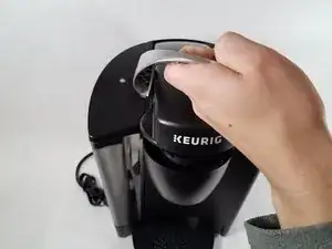 Схватите черную верхнюю крышку с логотипом Keurig и аккуратно отведите её назад к задней части устройства, чтобы освободить.