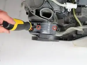 Отвинтите шланг, используя отвертку Philips #2, чтобы отсоединить его от верхней крышки пылесоса.