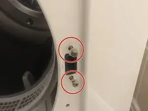 Если вы знаете, что замок неисправен, также ослабьте шурупы, обведенные желтым. Если вы удалите их полностью, замок может застрять у края сушилки при открывании.